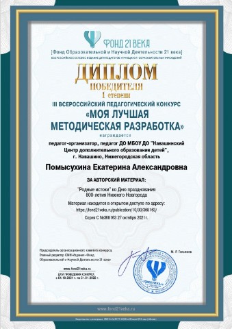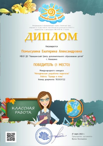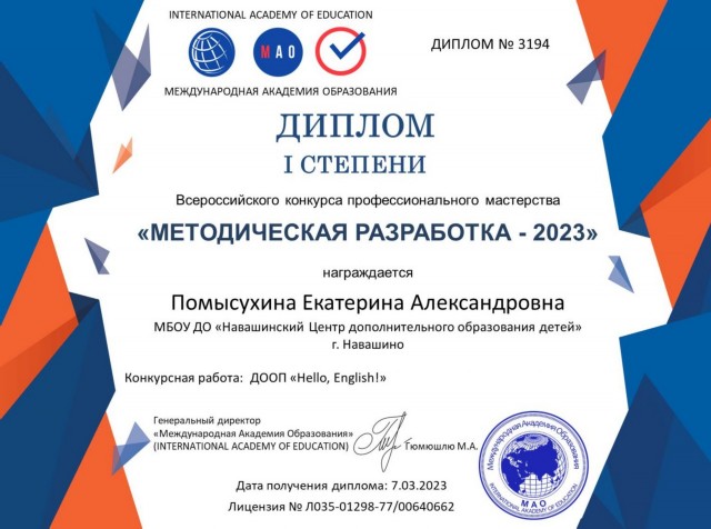 Победитель (1 место) международного конкурса методических разработок ДООП "Лингвики" |