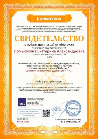 Свидетельство о публикации сценария мероприятия "Дружба - это я и ты!" |