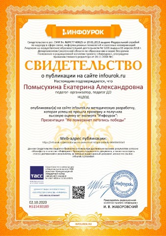 Свидетельство о публикации презентации "Не померкнет летопись победы" |