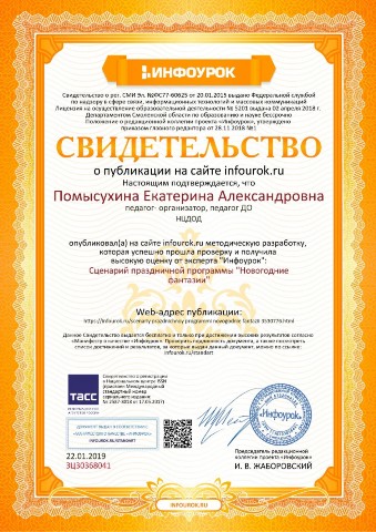 Свидетельство о публикации сценария праздничной программы "Новогодние фантазии" |