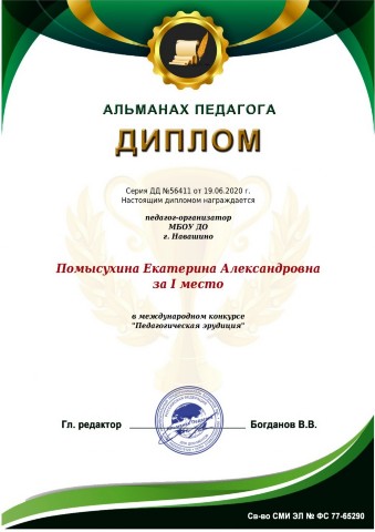 Диплом победителя (1 место) в международном конкурсе "Педагогическая эрудиция" |