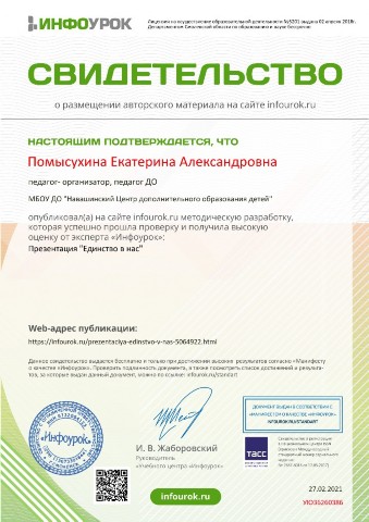 Свидетельство о публикации презентации "Единство в нас" |