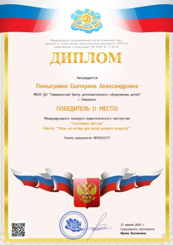 Диплом победителя (1 место) международного конкурса профессионального мастерства "Педагог дополнительного образования" Конспект занятия "Happy New Year" |
