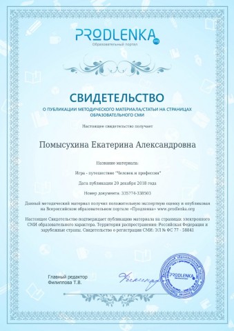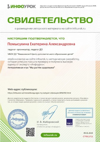 Свидетельство о публикации интерактивной игры